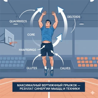 Ягодичные мышцы: Самые мощные мышцы тела, отвечают за разгибание тазобедренного сустава. Они генерируют огромную часть силы, необходимой для вертикального движения.