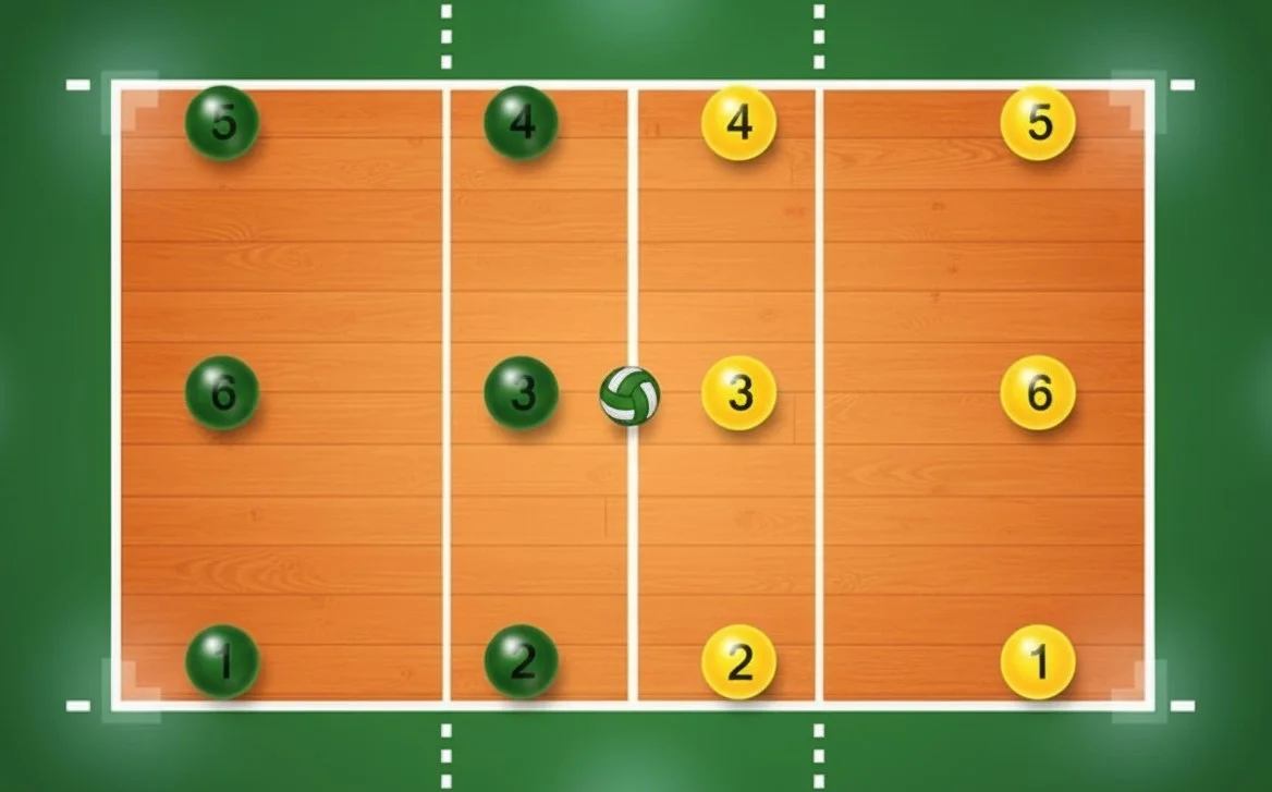 - Команды: На поле одновременно находятся по 6 игроков с каждой стороны. Полный состав волейбольной команды в заявке может достигать 14 человек.