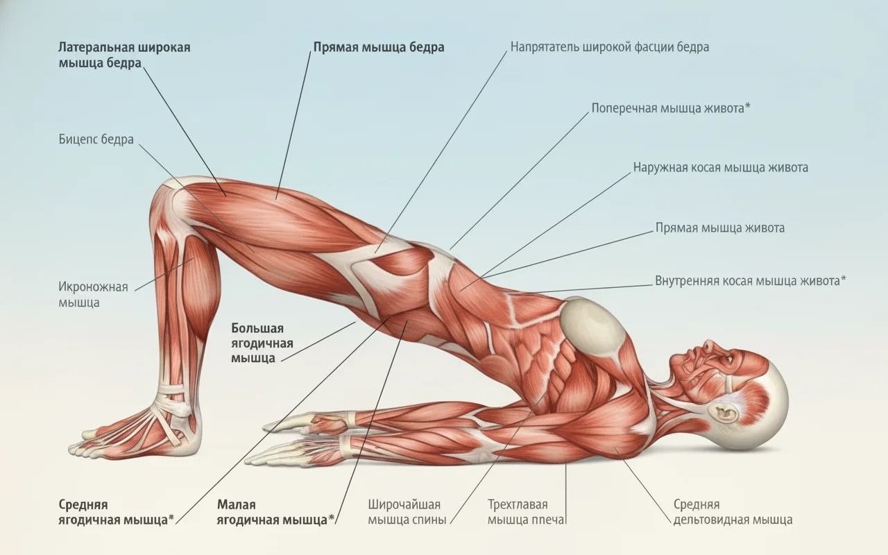 Анатомия и работа мышц. Мостик - разгибание бедра с акцентом на большую ягодичную, с участием средней/малой ягодичной для стабилизации таза и VMO для контроля колена над стопой. Нейтральная спина и фиксация лопаток удерживают корпус, кора стабилизирует таз и шейный отдел. Пиковое сокращение - в верхней точке изометрии.
