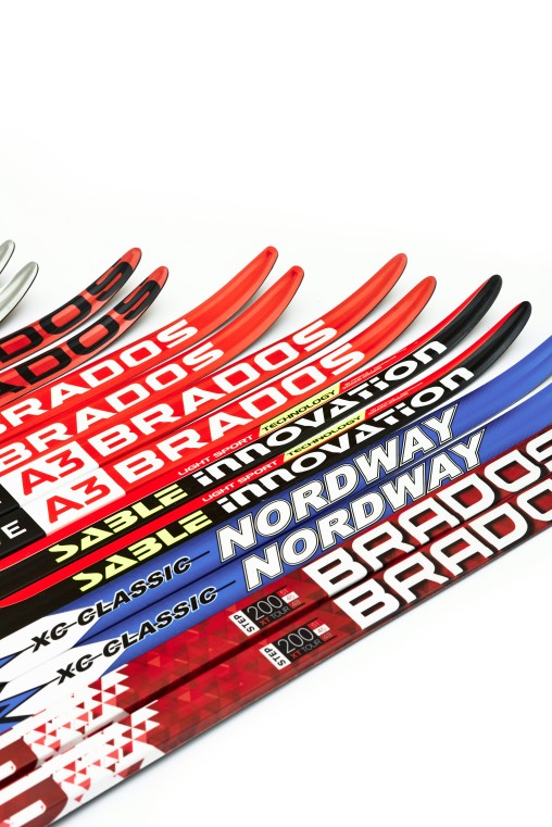 «Начинка» лыж — запрессованный в пластиковый кожух деревянный клин. Лыжи укреплены слоем сверхпрочного волокна в области колодки.