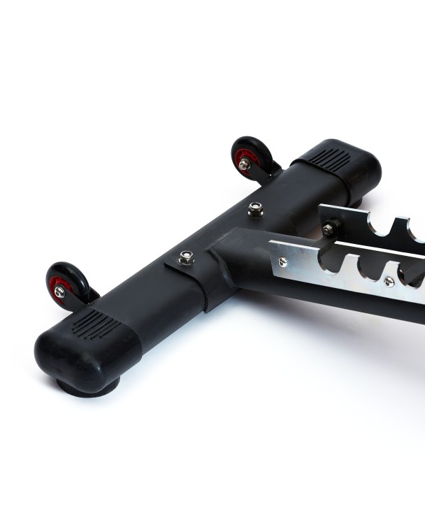 Для комфорта пользователя предусмотрены резиновые подпятники и обрезиненная ручка для перемещения скамьи. Тренажер также оснащен каучуковыми колесами для легкого перемещения по помещению.