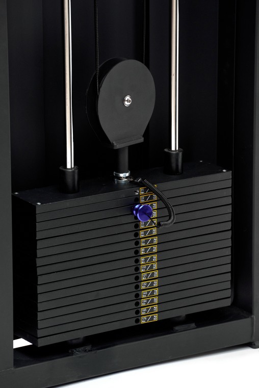 Рама тренажера изготовлена из прочных прямоугольных и квадратных профилей в графитово-черном цвете. Тренажер оснащен грузоблоком из 32 плит общим весом 160 кг. Грузоблоки закрыты металлическим кожухом с одной стороны. Для фиксации нужного веса предусмотрен штыревой фиксатор. Блочная система регулируется по высоте на 20 положений с шагом 75 мм, что позволяет настроить тренажер под любые цели тренировки.