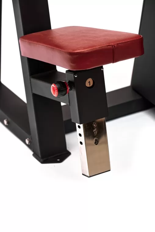 У тренажера имеется сидение и мягкий упор для рук, покрытые прочной и приятной искусственной кожей. Сидение регулируется по высоте с помощью вытяжного фиксатора с возможностью выбора из 8 положений регулировки. Тренажер также оснащен подвижными прорезиненными рукоятками для надежного хвата.